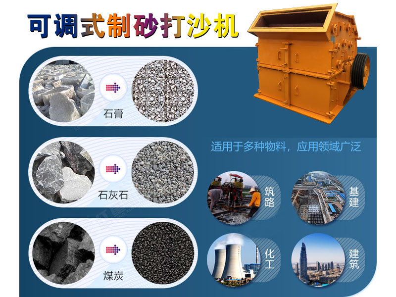 1612可調式打沙機廣泛應用于鐵路建設、公路建設、市政建設、水泥廠、建材業、陶瓷業、化工等領域,破碎石灰石、石膏、白堊、煤、明礬等中硬及較軟物料